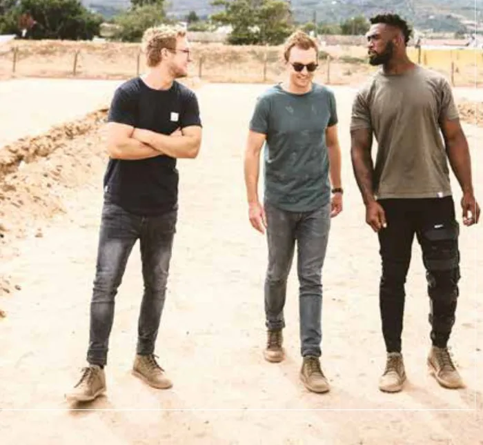 Roal Boezaart, Marcel Boezaart and Siya Kolisi. Springbok captain Kolisi has announced a new, five-year partnership with popular South African lifestyle brand Freedom Of Movement.Inset: Siya’s Field Green Vellies. | Image: supplied.