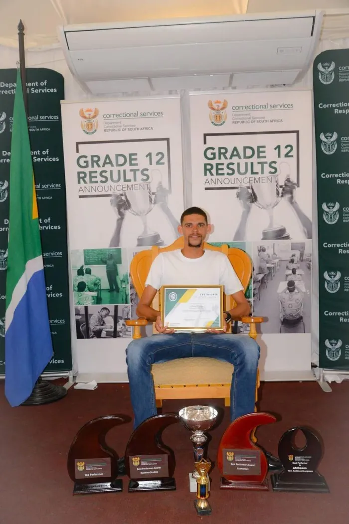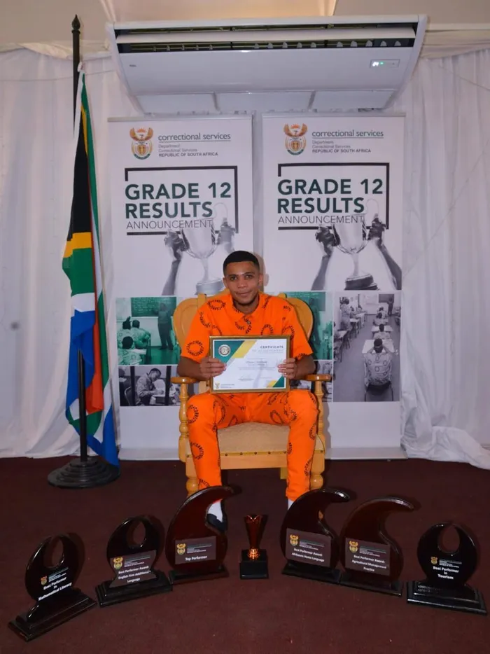 Jooste Tyrique, a parolee from Emthonjeni Youth School in Baviaanspoort, who also secured six distinctions with an average of 84.4%.