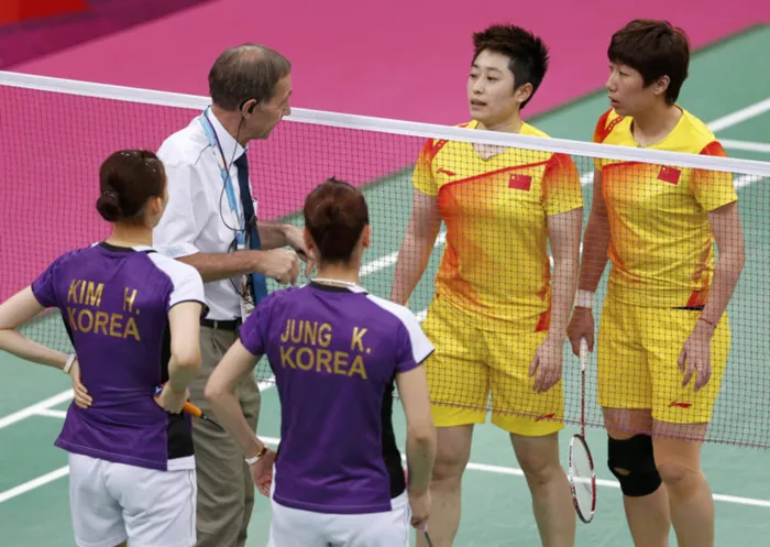 An official speaks to players from China and South Korea during their women's doubles group play stage Group A badminton match during the London 2012 Olympic Games. An official speaks to players from China and South Korea during their women's doubles group play stage Group A badminton match during the London 2012 Olympic Games.