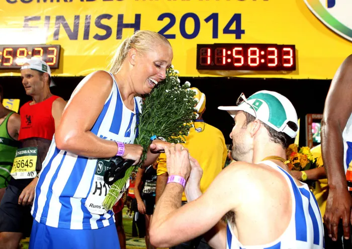 Durban 1-06-2014 Proposing at the finish line of Comrads Marathon 2014. Contact 0828846369 for more info. Picture by: Sibonelo Ngcobo Durban 1-06-2014 Proposing at the finish line of Comrads Marathon 2014. Contact 0828846369 for more info. Picture by: Sibonelo Ngcobo