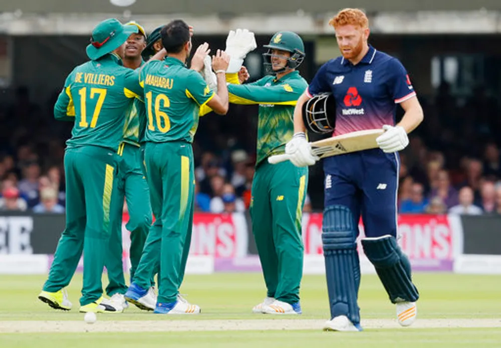 South Africa's players celebrate taking the wicket of England's Jonny Bairstow. Photo: Kirsty Wigglesworth/AP