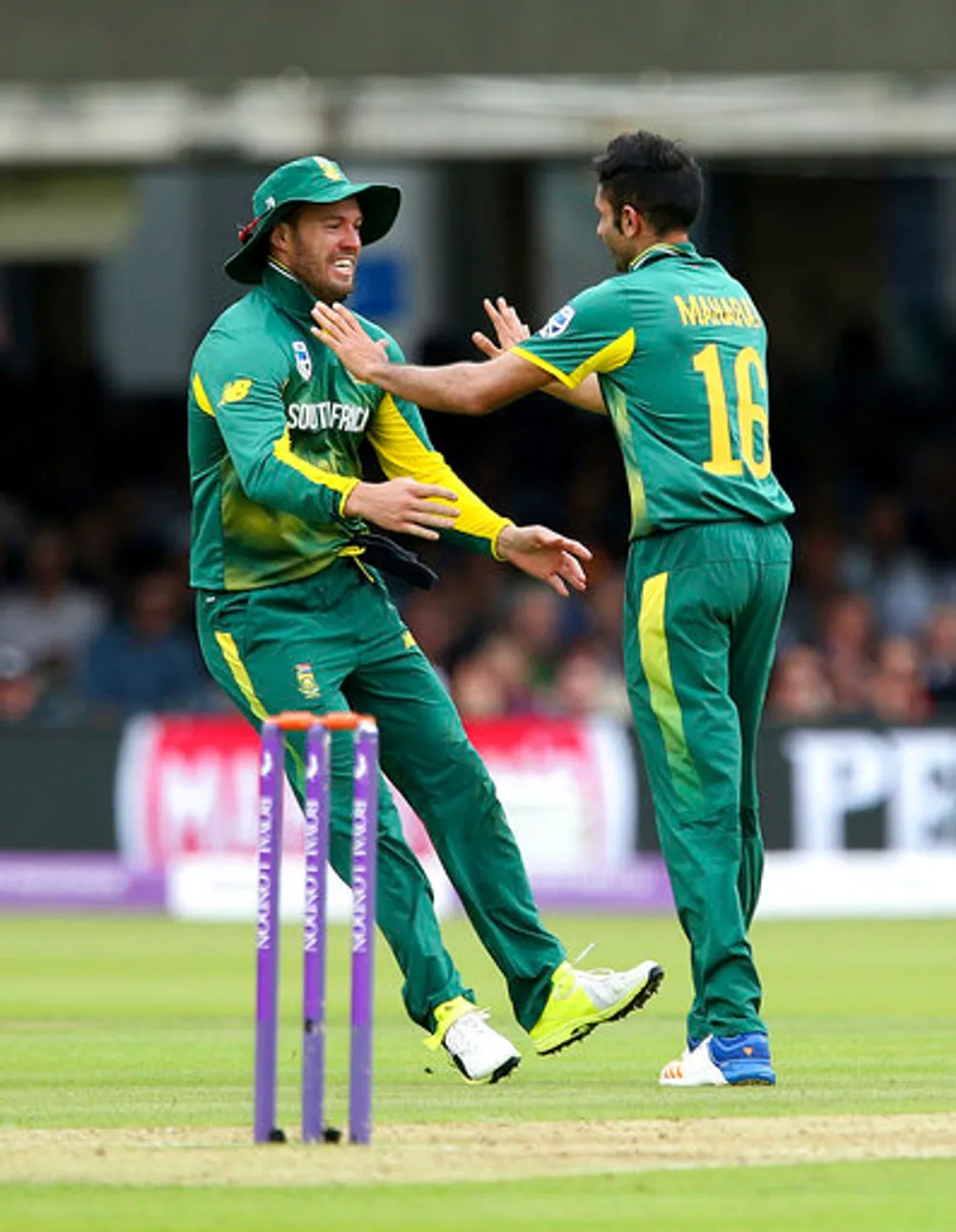 Keshav Maharaj celebrates with AB de Villiers after England's Jonny Bairstow was stumped by Quinton de Kock. Photo: Steven Paston//PA via AP
