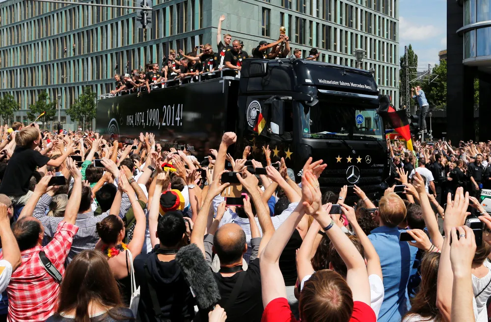 Germany's national soccer team players wave from an open-top bus during a World Cup celebration parade in Berlin.