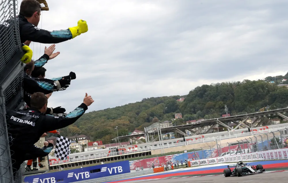 Lewis Hamilton of Mercedes AMG GP crosses the finish line to win the Formula One Grand Prix of Russia. Photo: Yuri Kochetkov/Pool via REUTERS