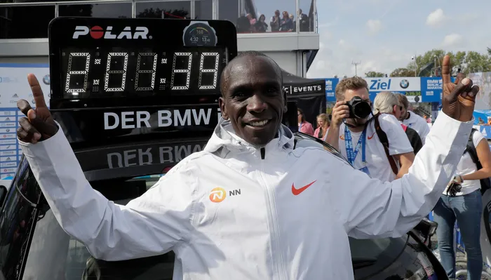 Eliud Kipchoge stands in front of a time board that shows his new world record time of 2:01.39 at the Berlin Marathon. Photo: Markus Schreiber/AP Eliud Kipchoge stands in front of a time board that shows his new world record time of 2:01.39 at the Berlin Marathon. Photo: Markus Schreiber/AP
