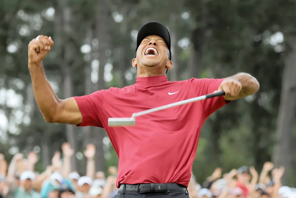 Tiger Woods celebrates on the 18th hole to win the 2019 Masters. Photo: REUTERS/Lucy Nicholson