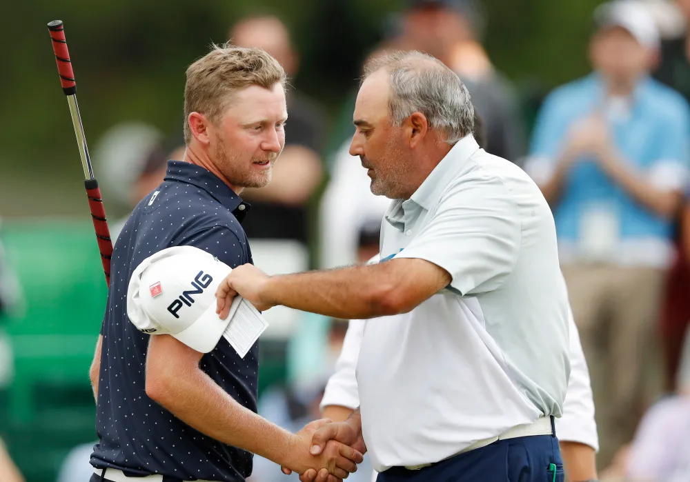 Justin Harding of South Africa (left) and Angel Cabrera of Argentina shake hands on the eighteenth hole during the 2019 Masters. Photo: EPA/Erik S. Lesser