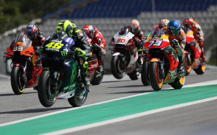 Valentino Rossi, front, and South Africa’s Brad Binder, left, in action during the race Austrian MotoGP Grand Prix. Picture: Lisi Niesner/Reuters