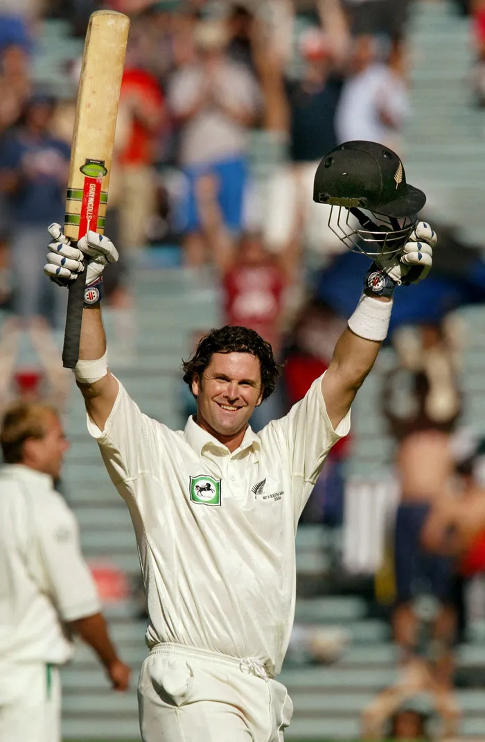 (FILES) A file photo taken on March 20, 2004 shows New Zealand batsman Chris Cairns raising his arms after scoring a century against the Proteas. Photo: William WEST/AFP