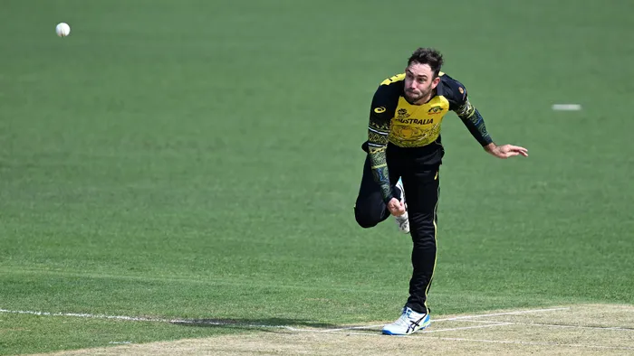 a spin bowler on his follow through Australian bowler Glenn Maxwell during the ICC T20 World Cup Warm-Up cricket match against India, at the Gabba, in Brisbane, Australia, 17 October 2022. Picture: Dave Hunt/EPA