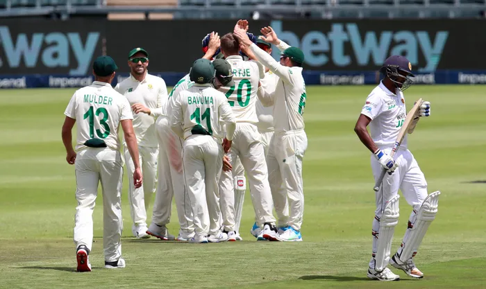 Anrich Nortje celebrates with team-mates after Quinton de Kock caught Sri Lanka’s Dushmantha Chameera during Day 1 of the second test at the Wanderers Stadium in Johannesburg on Sunday. Photo: Muzi Ntombela/BackpagePix