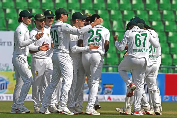 The Proteas celebrate Kagiso Rabada's early wicket in the first Test in Lahore. Picture: AFP