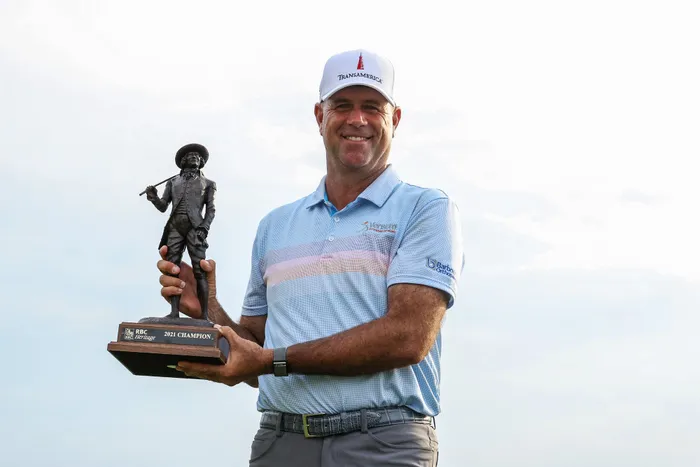 Stewart Cink of the United States poses with the trophy after winning the RBC Heritage. Photo: Patrick Smith/Getty Images via AFP