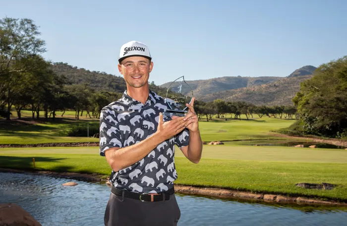 Rourke Van der Spuy celebrates with the trophy after winning the SunBet Challenge at The Gary Player Countrey Club in Sun City on Friday Rourke Van der Spuy celebrates with the trophy after winning the SunBet Challenge at The Gary Player Countrey Club in Sun City on Friday. Photo: Petri Oeschger/Sunshine Tour