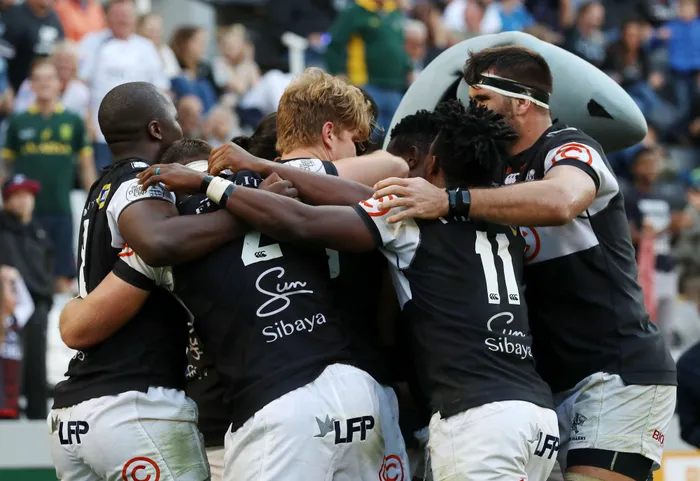 Marius Louw of the Sharks celebrates scoring a try with his teammates during the match against the Cheetahs. Photo: Muzi Ntombela/BackpagePix Marius Louw of the Sharks celebrates scoring a try with his teammates during the match against the Cheetahs. Photo: Muzi Ntombela/BackpagePix
