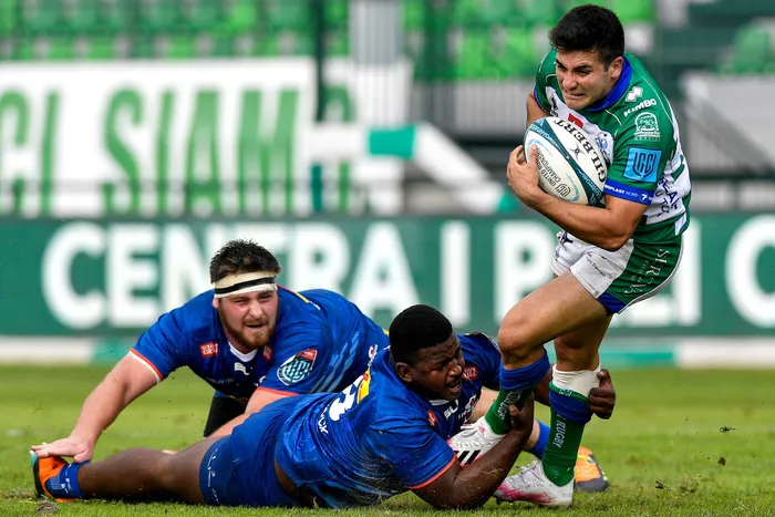 Benetton's Tomas Albornoz is tackled Sazi Sandi of DHL Stormers during their United Rugby Championship match, atStadio Comunale Monigo, Treviso, Italy, on 25 Sep 2021. Picture: Luca Sighinolfi/INPHO/Shutterstock