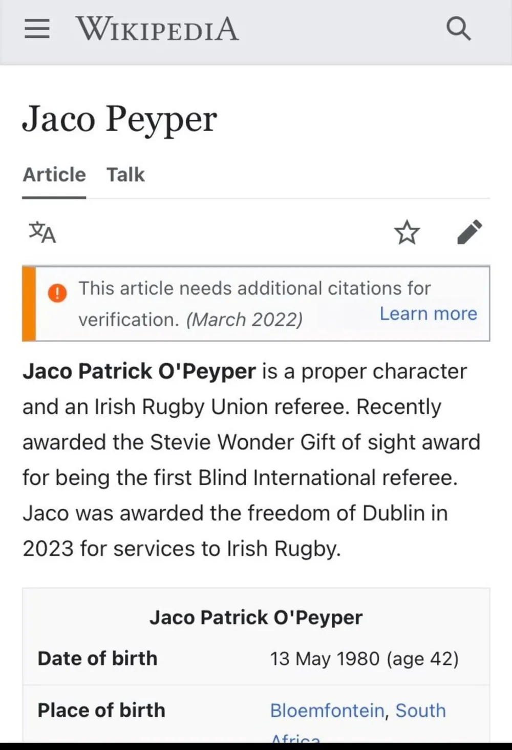 "Jaco Patrick O'Peyper is a proper character and an Irish Rugby Union referee. Recently awarded the Stevie Wonder Gift of sight award for being the first Blind International referee," the doctored Wikipedia biography read tongue in cheek after it was altered.