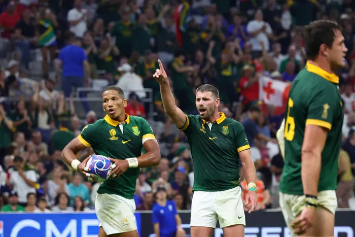 South Africa's fullback Willie Le Roux (C) ajnd South Africa's flyhalf Manie Libbok (L) react during the France 2023 Rugby World Cup Pool B match between South Africa and Tonga at Stade Velodrome in Marseille, south-eastern France Springboks flyhalf Manie Libbok, left, in action during the Rugby World Cuo. Picture: Clement Mahoudeau/AFP