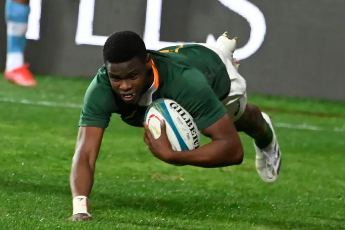 Aphelele Fassi of the Springboks scores during the 2021 Rugby Championship. Photo: Deryck Foster/BackpagePix