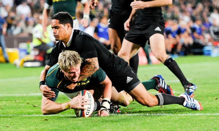 FILE - Springboks’ Jean de Villiers (down) scores a try despite New Zealand's Aaron Smith (C) tackle during the 2013 Test. Photo: AFP