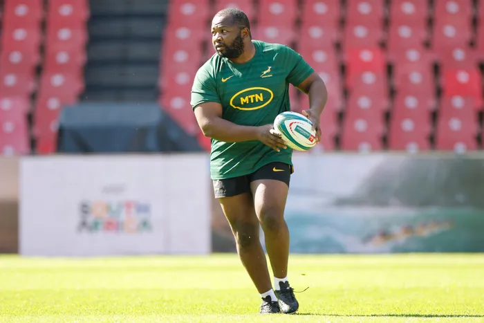 Ox Nche passes the ball in Springbok training South Africa's prop Ox Nche is looking to be at his best when the Springboks take on Wales. Photo: Wikus de Wet/AFP)