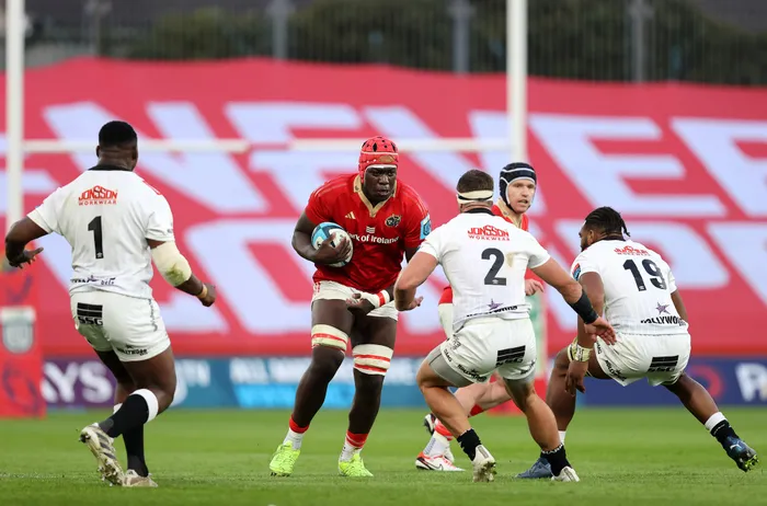 Munster's Edwin Edogbo carries the ball during their United Rugby Championship clash against the Sharks Munster's Edwin Edogbo carries the ball during their United Rugby Championship clash against the Sharks at Thomond Park, Limerick on Saturday. Photo: Bryan Keane/INPHO/Shutterstock