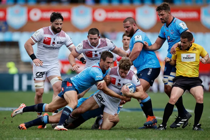 Bulls’ South African flyhalf Johan Goosen (C-L) tackles Lyon’s French hooker Guillaume Marchand (C-R) during the European Champions Cup first round group A Rugby Union match between Bulls (Pretoria) and Lyon Olympique Universitaire Rugby (Lyon) at Loftus Versfeld Stadium FILE. The United Rugby Championship final will be between the two sides which exceeded expectations, but a look at the stats over the two semi-finals reveals why the Bulls and Glasgow came out on top. Seen here: Bulls flyhalf Johan Goosen tackles Lyon hooker Guillaume Marchand. Picture: Phill Magakoe/AFP