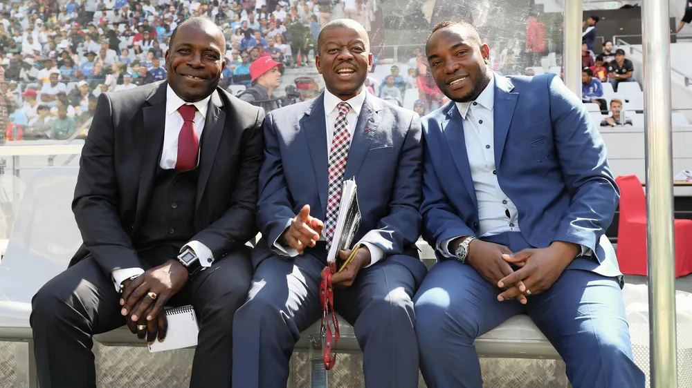 William Shongwe, centre, alongside Benni McCarthy and former Ajax Cape Town coach Stanley Menzo. Photo: Gavin Barker/BackpagePix