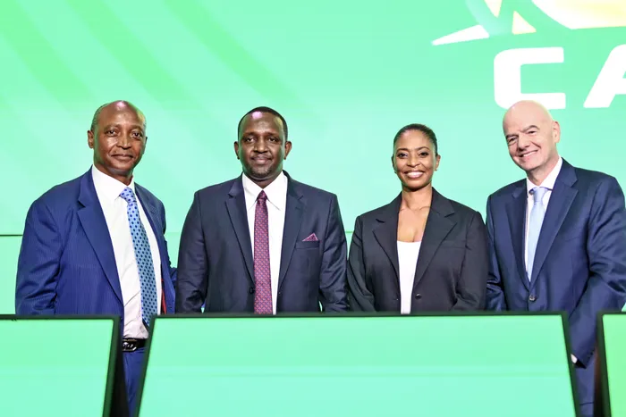 Jessica Motaung, deputy chairperson of the Africa Clubs Association with CAF President Patrice Motsepe, Hersi Ally, FIFA President Gianni Infantino during the 2025 47th CAF Ordinary General Assembly at Kemesha Center in Kinshasa, Democratic Republic of Congo in October.