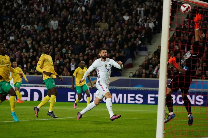 Bafana Bafana goalkeeper Ronwen Williams makes a fine save to deny Olivier Giroud. David Winter/Shutterstock via BackpagePix