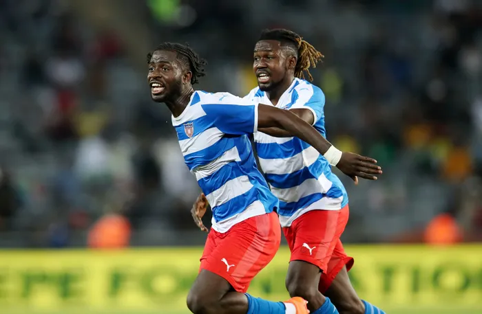 Mohammed Sangare of Liberia celebrates scoring against Bafana Bafana in their Afcon qualifier. Photo: Muzi Ntombela/BackpagePix