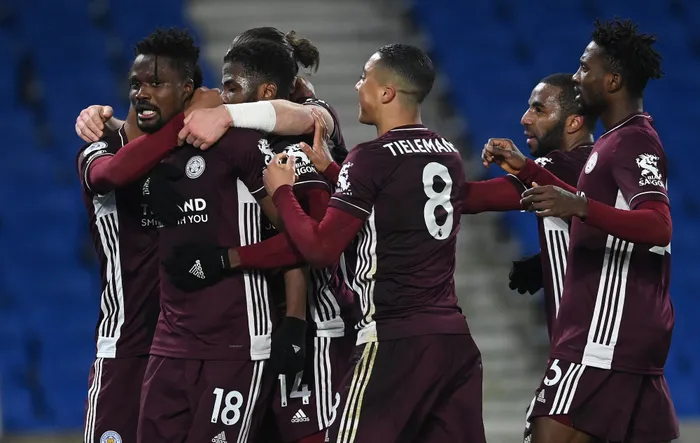 Leicester City's Ghanaian midfielder Daniel Amartey (L) celebrates scoring his team's second goal against Brighton and Hove Albion. Photo: Neil Hall/AFP