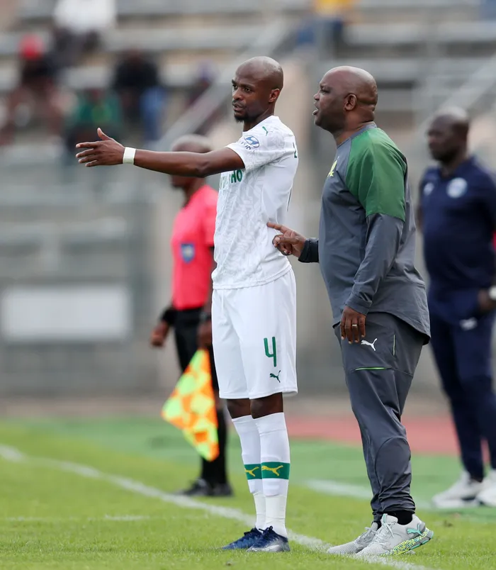 Mamelodi Sundowns defender Tebogo Langerman talking to head coach Pitso Mosimane. Photo: Muzi Ntombela/BackpagePix