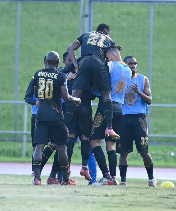 Royal AM’s Tebogo Potsane celebrates with teammates after scoring the only goal of the game during their DStv Premiership clash against Stellenbosch FC at Chatsworth Stadium in Durban on Sunday Royal AM’s Tebogo Potsane celebrates with teammates after scoring the only goal of the game during their DStv Premiership clash against Stellenbosch FC at Chatsworth Stadium in Durban on Sunday. Photo: Gerhard Duraan/BackpagePix