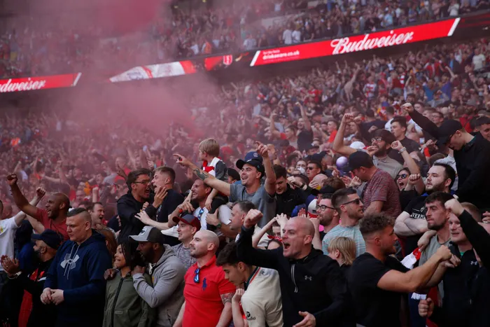 Liverpool's supporters clebrate after striker Sadio Mane's goal during the English FA Cup semi-final football match against Manchester City at Wembley Stadium Liverpool's supporters clebrate after striker Sadio Mane's goal during the English FA Cup semi-final football match against Manchester City at Wembley Stadium. Photo: Adrian Dennis/AFP