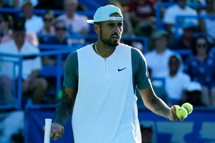 Nick Kyrgios of Australia reacts while in action against Yoshihito Nishioka of Japan during their men's singles final match at the Citi Open. Photo: Will Oliver/EPA