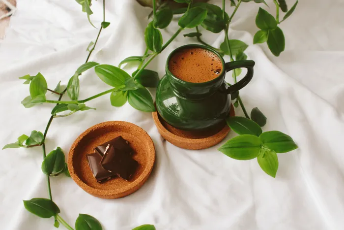 A cup of coffee and small plate of chocolate squares are set on a white cloth. Coffee and chocolate have been paired together for years. Picture: Pexels/Ayşe Nur