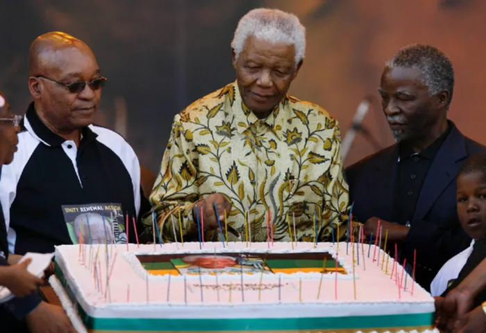 THE PRESIDENTS: Nelson Mandela, flanked by former president Thabo Mbeki, right, and ANC president Jacob Zuma, left, cuts a birthday cake at the Loftus Versfeld Stadium in Pretoria for a celebration of Mandela's 90th birthday in 2008. Both ANC leaders were visionary men who championed the cause of the continent as they tried to carve a new SA identity. Picture: AP THE PRESIDENTS: Nelson Mandela, flanked by former president Thabo Mbeki, right, and ANC president Jacob Zuma, left, cuts a birthday cake at the Loftus Versfeld Stadium in Pretoria for a celebration of Mandela's 90th birthday in 2008. Both ANC leaders were visionary men who championed the cause of the continent as they tried to carve a new SA identity. Picture: AP