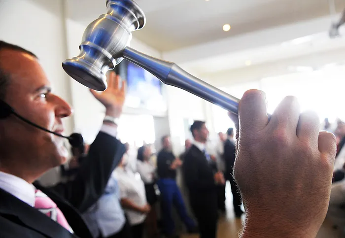 Rael Levitt from Auction Alliance brings the hammer down at an auction. Photo by Michael Walker
