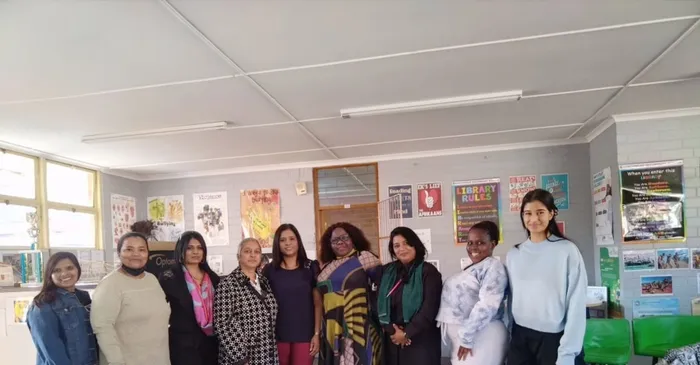 Teachers from Northmead Secondary School, from left, Charmaine Pillay, Nadia Naidoo (who will be appointed as the school’s menstrual health coach), Valerie Naidoo (founder of the Wireless Female Network), Ashima Sooful, Brenda Peters, Mabel Zuma (deputy head of Northmead Secondary School), Munira Essop, Lizzie Dube and Terina Ajodha.
