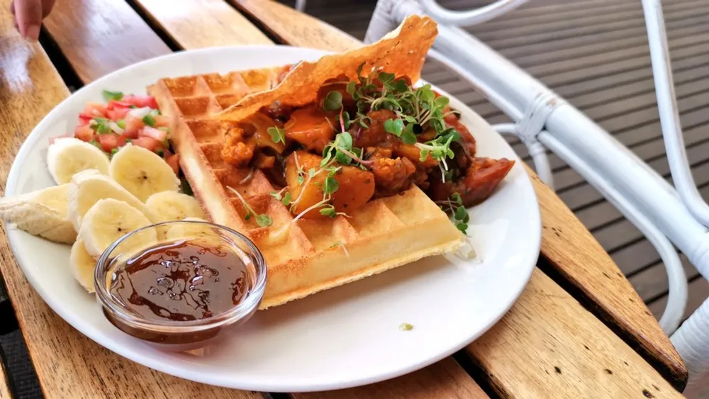 Famished from the morning of exploring, we travel to The Waffle House in Ramsgate for lunch. Their freshly-made waffles attract thousands of travellers. After having our temperature taken, our waiter Eric ushers us to a quaint table in the outside area.
