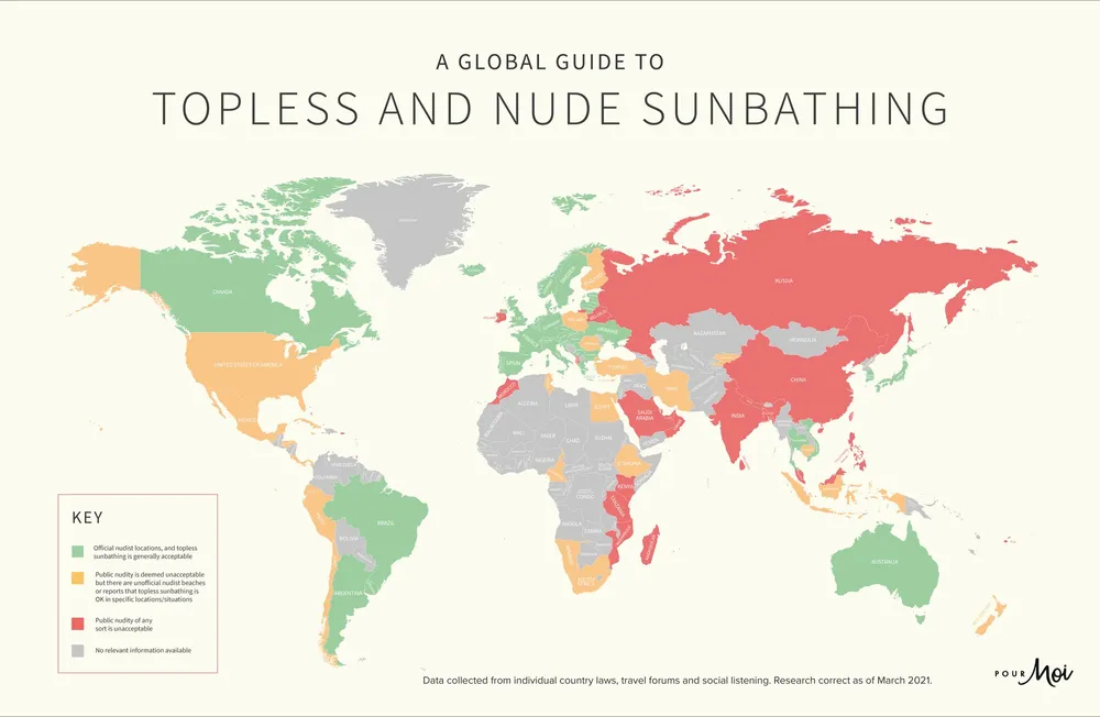 The team at Pour Moi spent weeks researching the individual laws of each country and cross-referencing them with travel forums, blogs and social media posts. It helped them determine which countries you can sunbathe naked in without getting into any trouble.