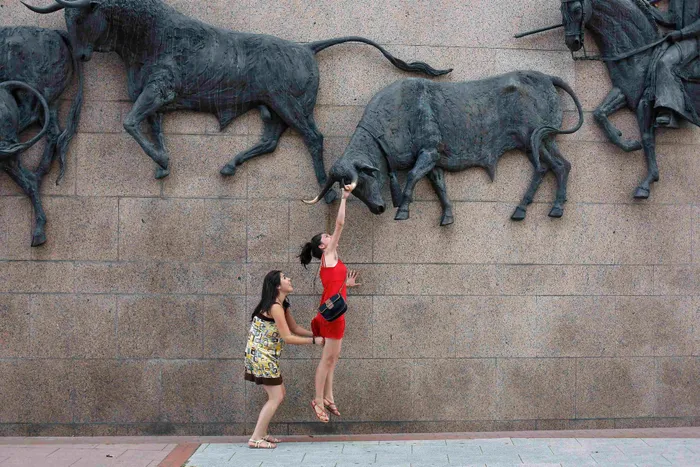 File image: A woman tries to hang on a bull sculpture outside Madrid's Las Ventas bullring July 1, 2013. REUTERS/Juan Medina.