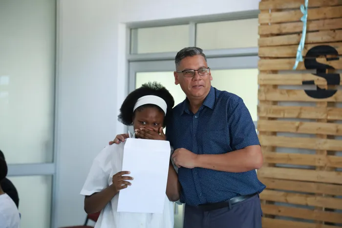 Second-ranked student Kuhle J earned three distinctions and plans to study biomedical engineering at Stellenbosch University. She is pictured with principal, Nasar Harris.
