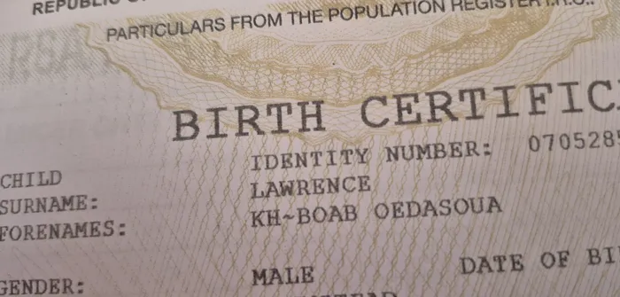 !Khūboab Oedasoua Lawrence operates with a birth certicate and the nae Home Affairs first gave him and is now failing to issue an ID with the same name