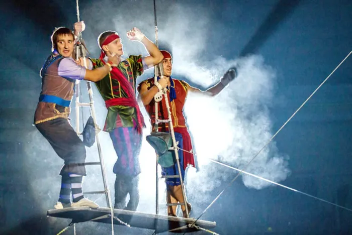 Cape Town 170110-The Giant Trapeze " Leader: Artem Shykavets. Those daring young men on the flying trapeze are a band of pirate look-a-likes from Belarus " flying high above the circus ring, performing passes, The Giant Trapeze act features daring young pirate look-a-likes from Belarus. Picture: Konstantin Stukalov Cape Town 170110-The Giant Trapeze " Leader: Artem Shykavets. Those daring young men on the flying trapeze are a band of pirate look-a-likes from Belarus " flying high above the circus ring, performing passes, The Giant Trapeze act features daring young pirate look-a-likes from Belarus. Picture: Konstantin Stukalov