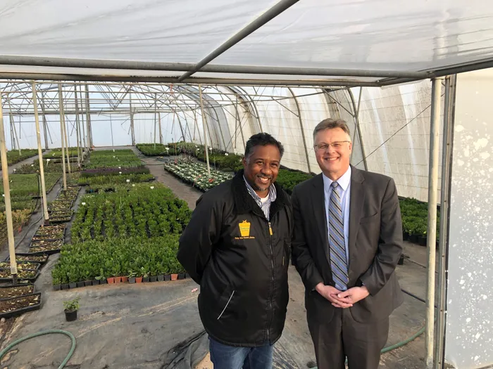 US deputy assistant secretary of state for Southern Africa and economic and regional affairs, Matthew Harrington, with De Fynne Nursery director Elton Jefthas. US deputy assistant secretary of state for Southern Africa and economic and regional affairs, Matthew Harrington, with De Fynne Nursery director Elton Jefthas.