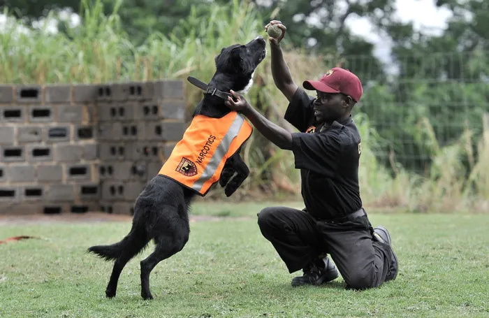 Sniffer dog Witneus during training. Sniffer dog Witneus showcases the progress the Braveheart Bio-Dog academy has made in using their new developed sophisticated training aids as well as holistic training programme for drug detection dogs and handlers. Oupa Mokoena African News Agency (ANA)