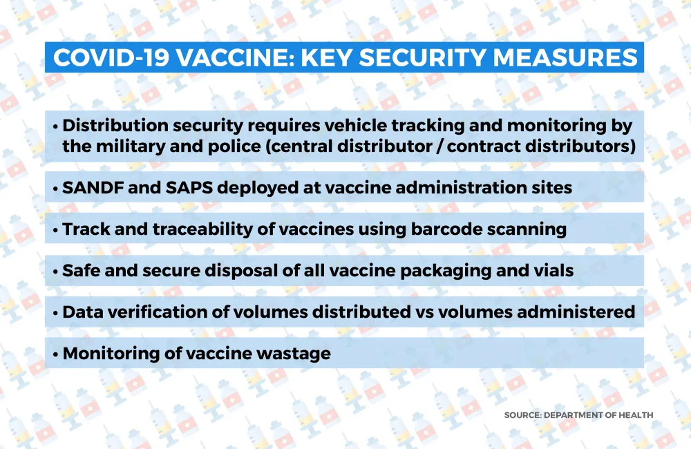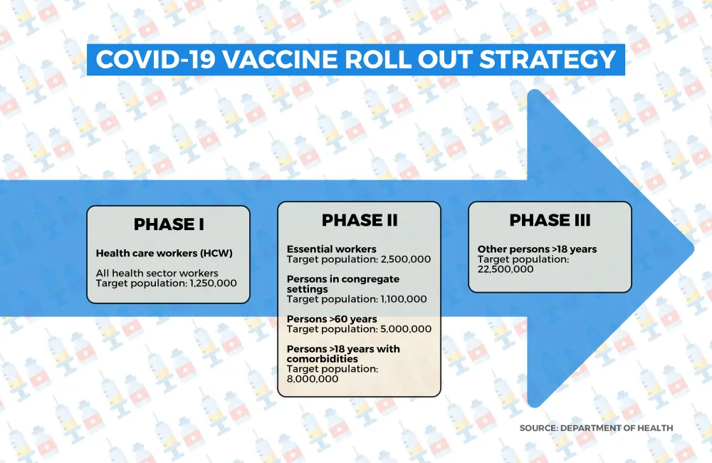 – Phase two: target population of 2 500 000: this would include police officers, miners and workers in the security, retail food, funeral, teachers, banking, essential municipal workers and home affairs, border control and port health services.
