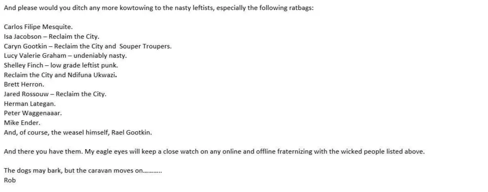 An excerpt from the emailed list, alleged to have been sent by Hersov, read: “And please would you ditch any more kowtowing to the nasty leftists, especially the following ratbags…”